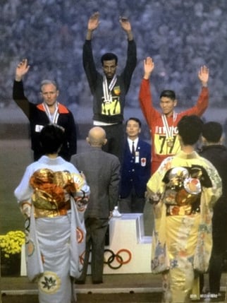1964年の東京オリンピック、小学生の私は、成長を遂げる日本が世界にアピールする祭典を、浮き浮きしながら眺めていました。左側に掲載したのはマラソンの表彰式の写真です。3位と健闘した円谷選手への尊敬心と同時に、メダルを運ぶ女性の着物姿が何と美しく、晴れやかに思ったことか。この東京オリンピックは、アジア初のスポーツの祭典であると同時に、日本の素晴らしい着物文化を世界に広めた祭典でもあったのです。