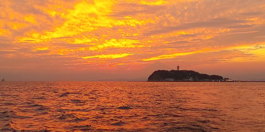 先日、友人から逗子花火大会を海上から観るイベントに誘われ、これは行かなければということで、酔い止め薬を持参し参加してきました。花火ももちろん最高だったんですが、お話したいのはこの夕焼けです。