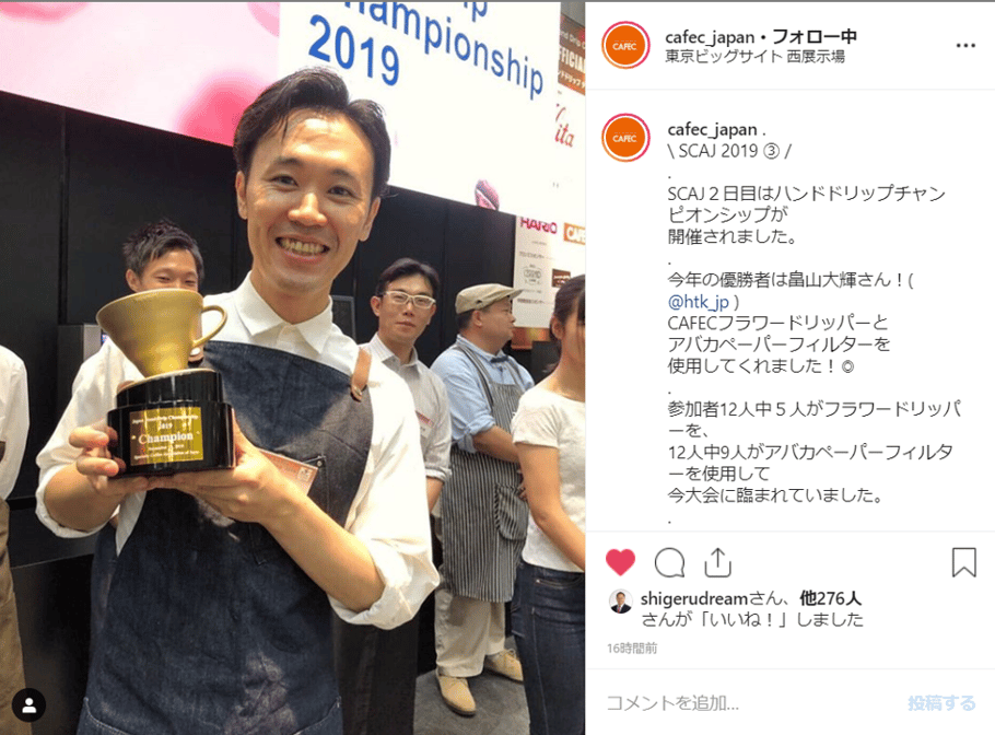 近年大きな関心を集めているドリップコーヒーですが、9月11~13日に東京ビッグサイトで開催されたSCAJ(Specialty Coffee Association Japan)2019に於いて実施されたハンドドリップチャンピオンシップで、優勝者のみならず、参加者12名中5名が、CAFECのフラワードリッパーを使用しました。ペーパーフィルターに至っては、9人が使用し独壇場でした。